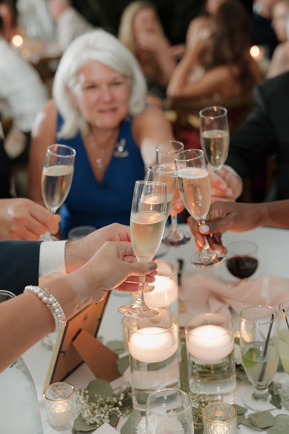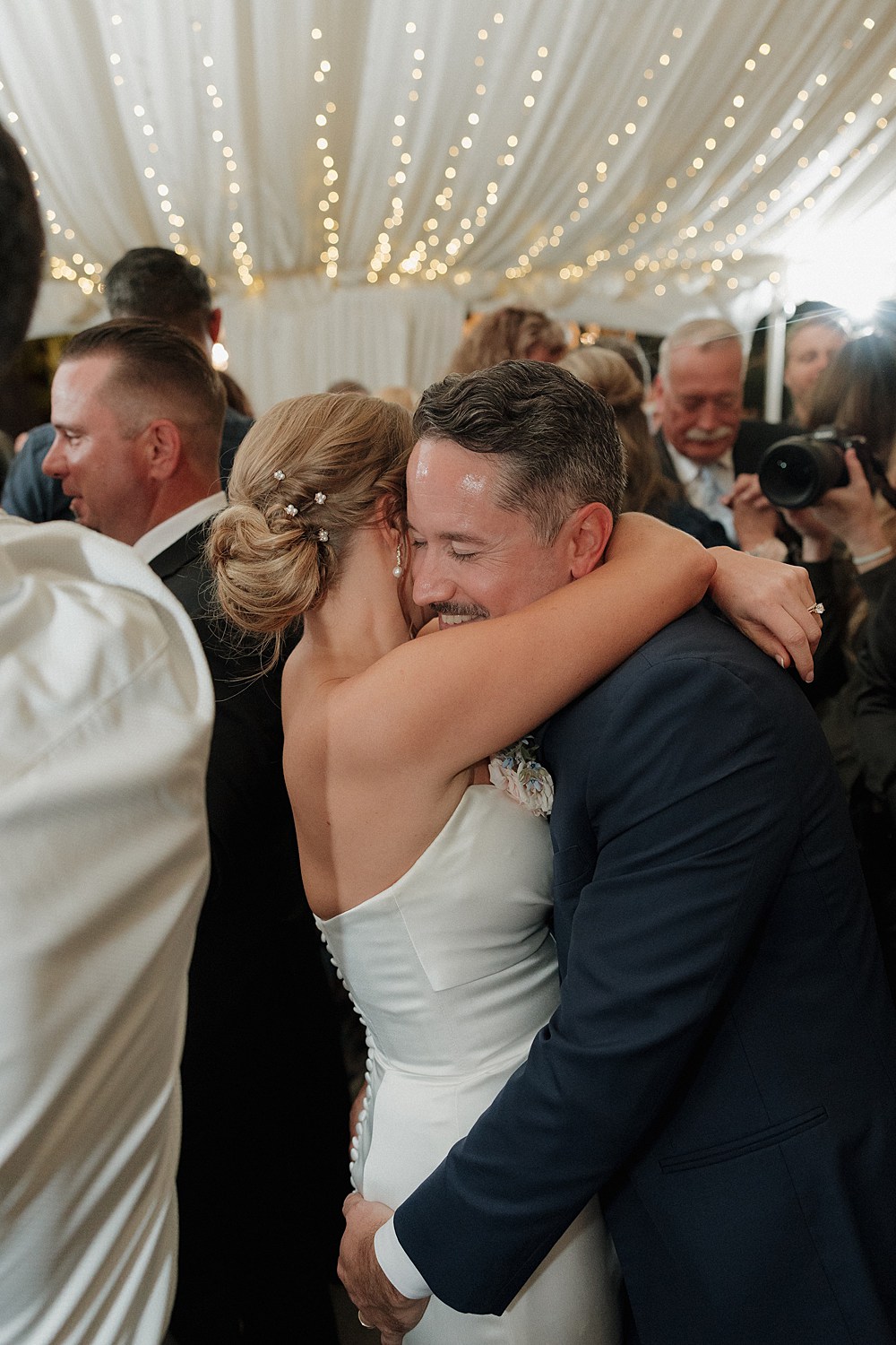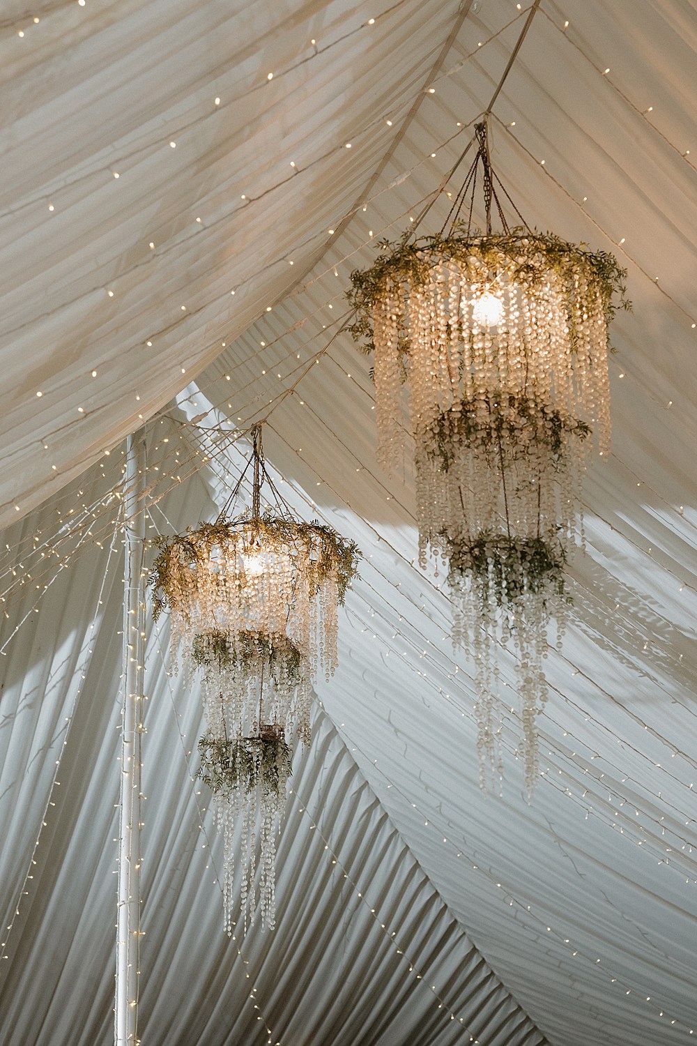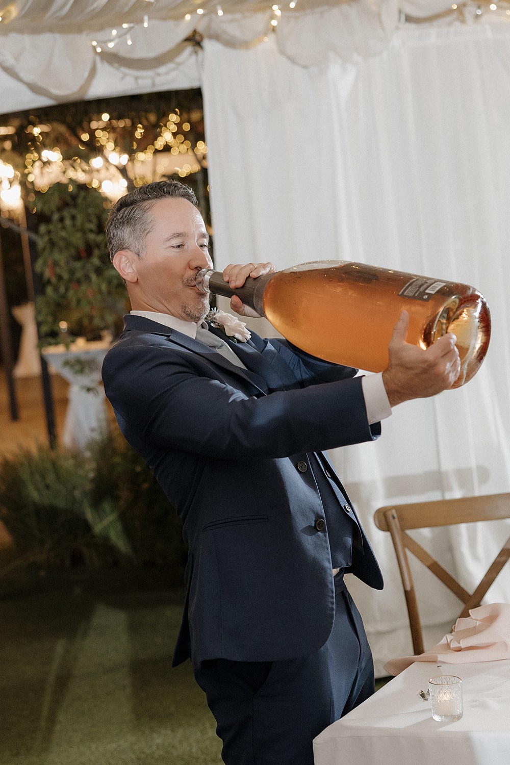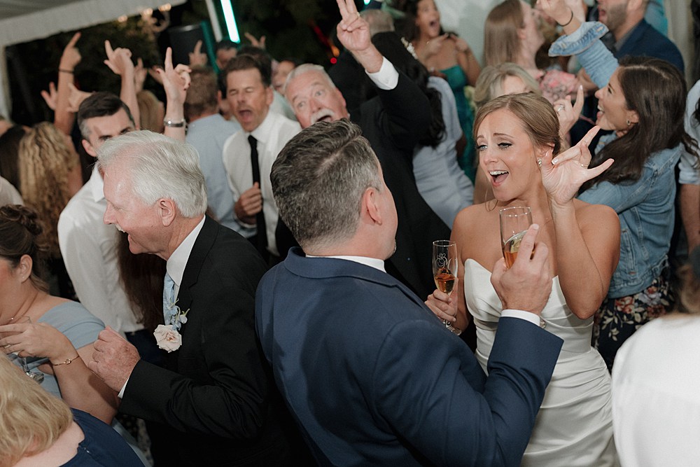As the day moved into the evening, their Twin Oaks Garden wedding became even more magical. Dinner and dancing happened under a beautiful tented pavilion with chandeliers glowing overhead, surrounded by towering trees and garden lights sparkling everywhere. It was so cozy and romantic.