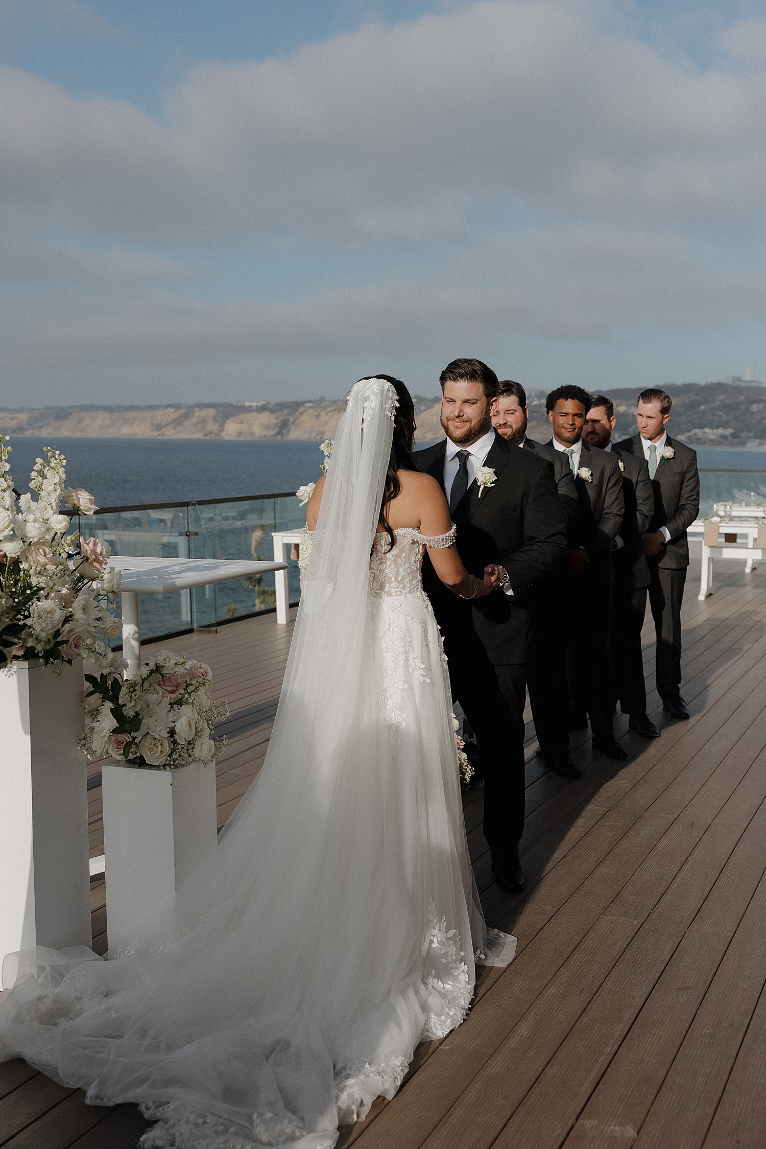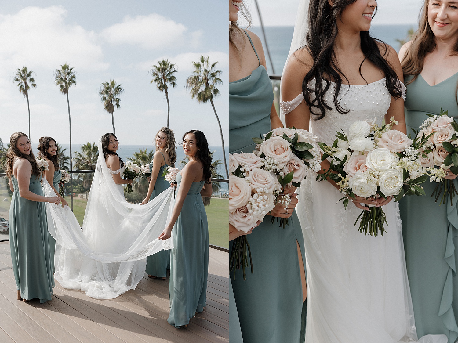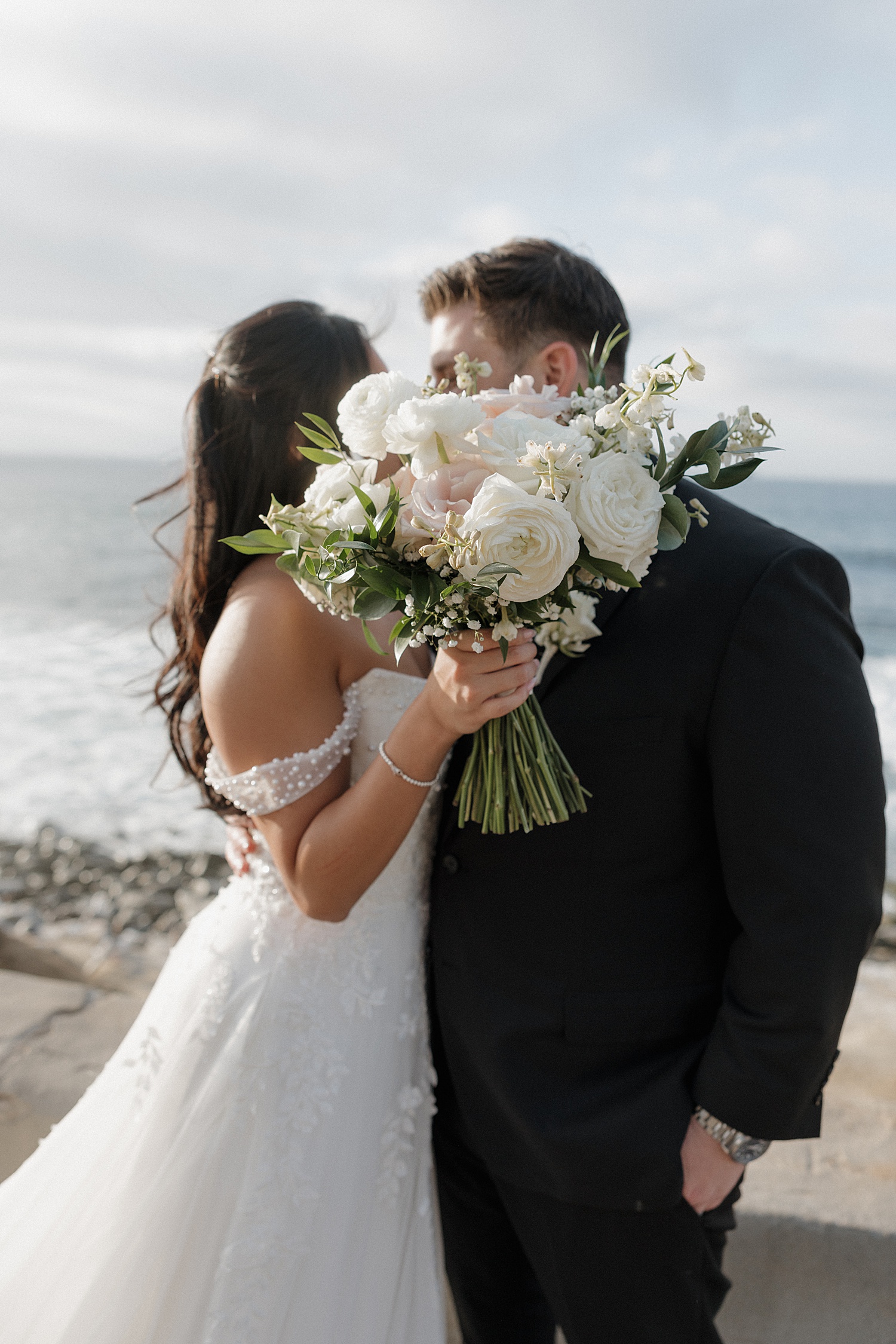 Following the ceremony, we made our way down to the coastline for portraits, where the beauty of their La Jolla Cove Hotel wedding truly came to life. Alyssa’s veil caught the wind in the most incredible way, creating soft, flowing movement that felt almost cinematic. The palette of the day—creamy whites, soft blush tones, and coastal greens—paired so beautifully with the muted blues of the ocean, creating imagery that felt both elevated and organic.