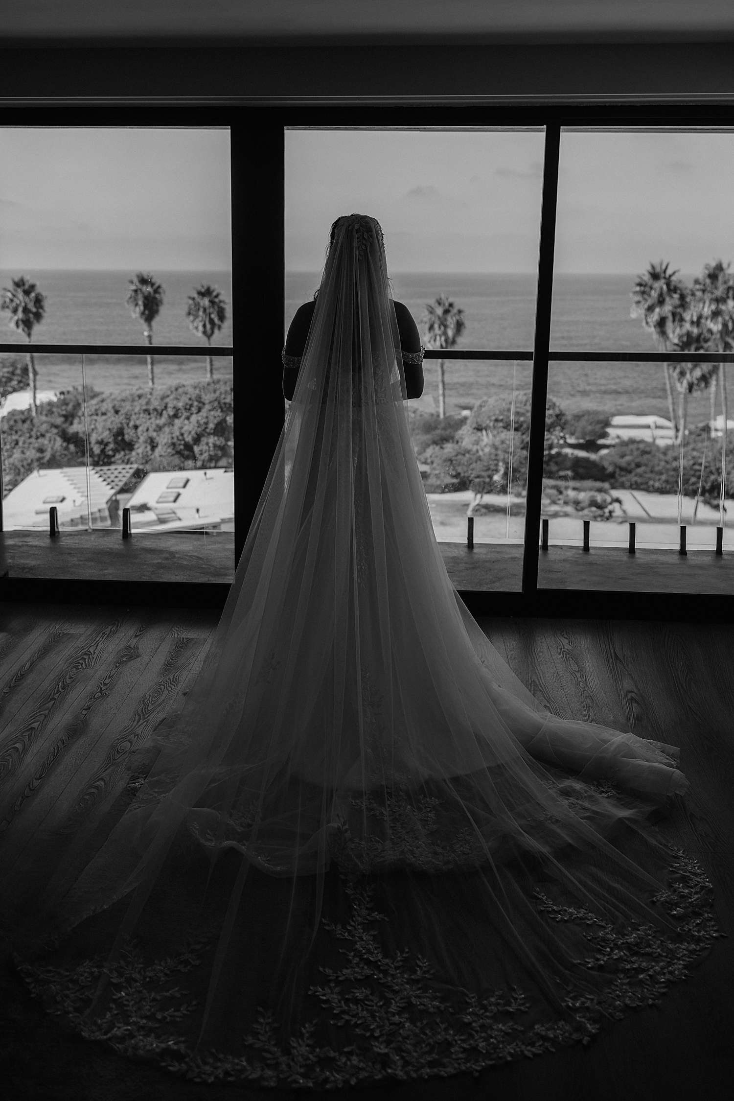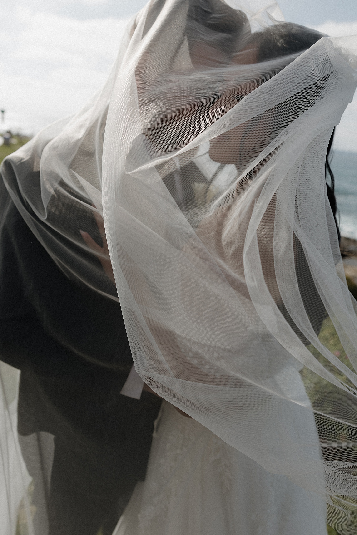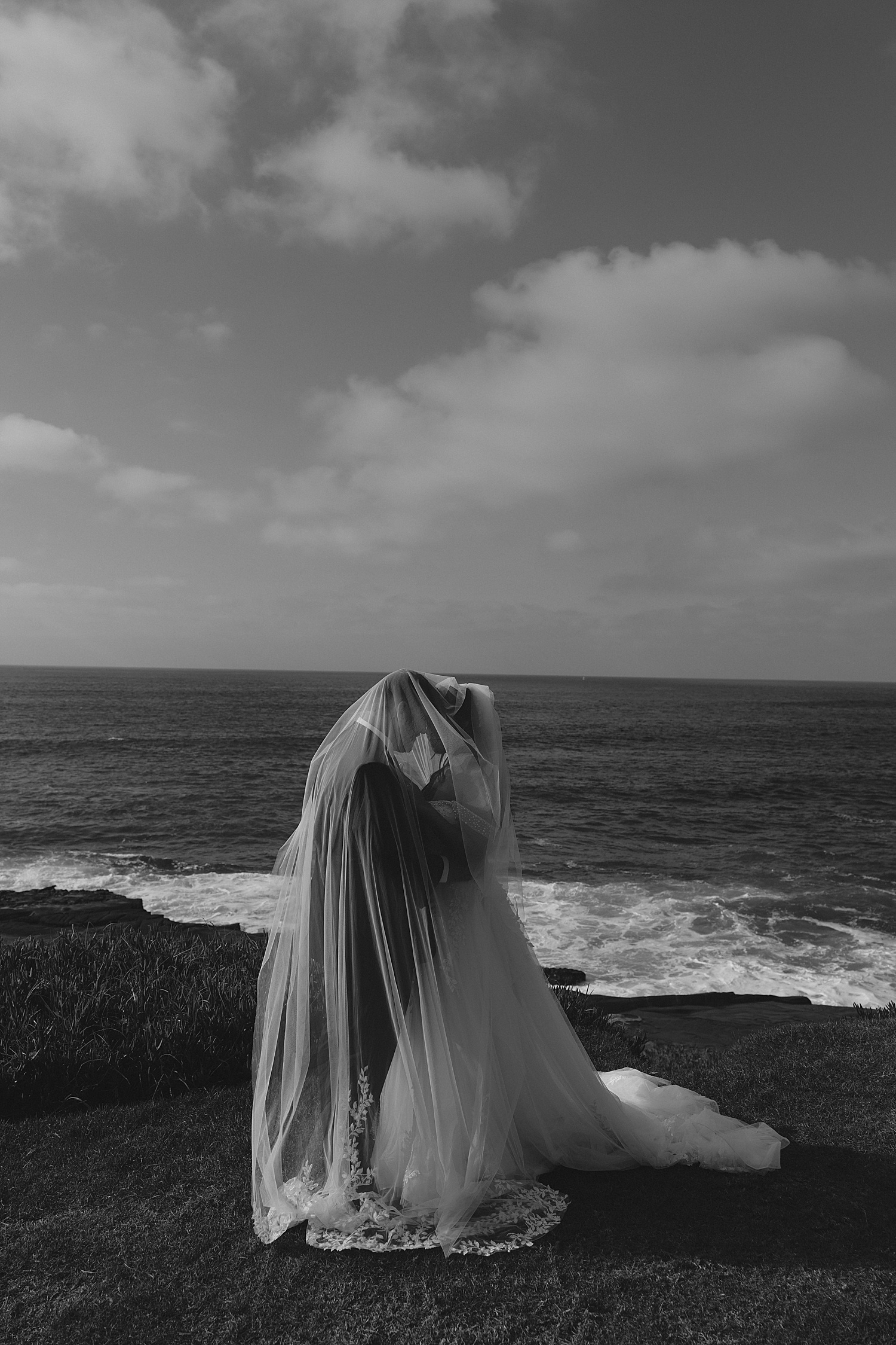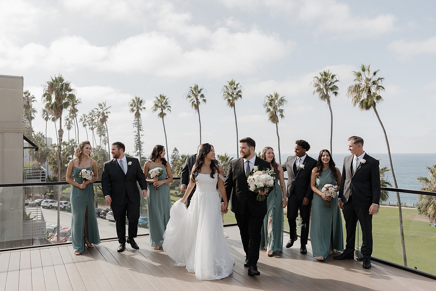 Following the ceremony, we made our way down to the coastline for portraits, where the beauty of their La Jolla Cove Hotel wedding truly came to life. Alyssa’s veil caught the wind in the most incredible way, creating soft, flowing movement that felt almost cinematic. The palette of the day—creamy whites, soft blush tones, and coastal greens—paired so beautifully with the muted blues of the ocean, creating imagery that felt both elevated and organic.