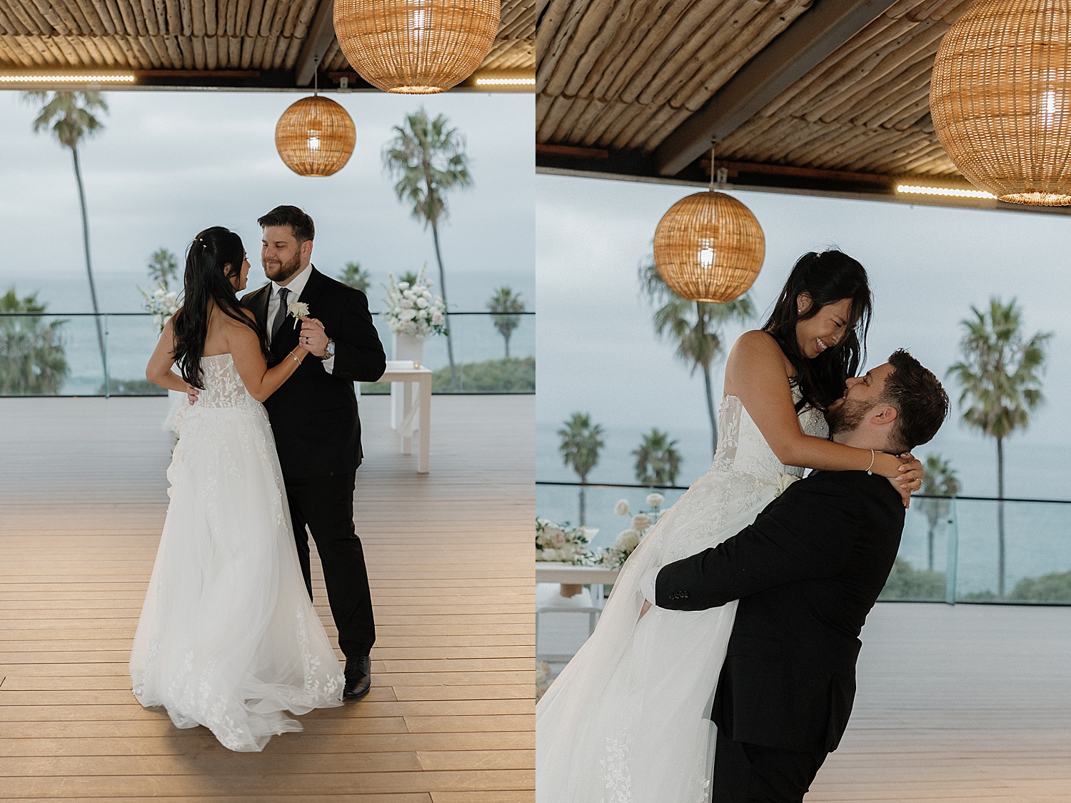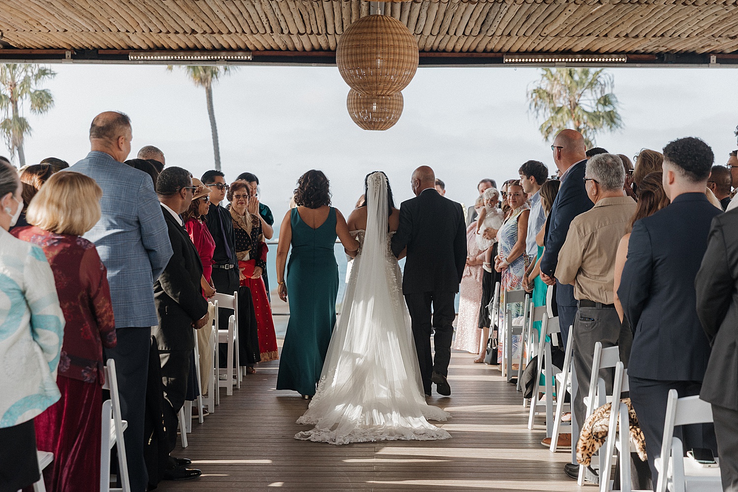 Their ceremony overlooking the ocean was nothing short of breathtaking. Clean white florals framed the altar, allowing the natural beauty of the coastline to take center stage. The soft ocean breeze, the light filtering through the palms, and the serene backdrop created an atmosphere that felt both intimate and grand. As Alyssa and Justin shared their first kiss as husband and wife, it was one of those moments that felt suspended in time—effortless, emotional, and deeply meaningful.