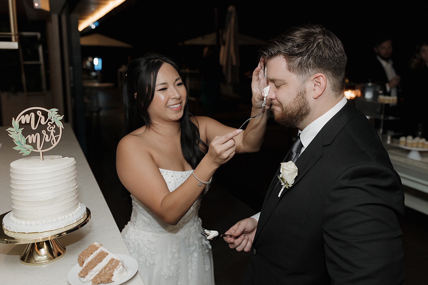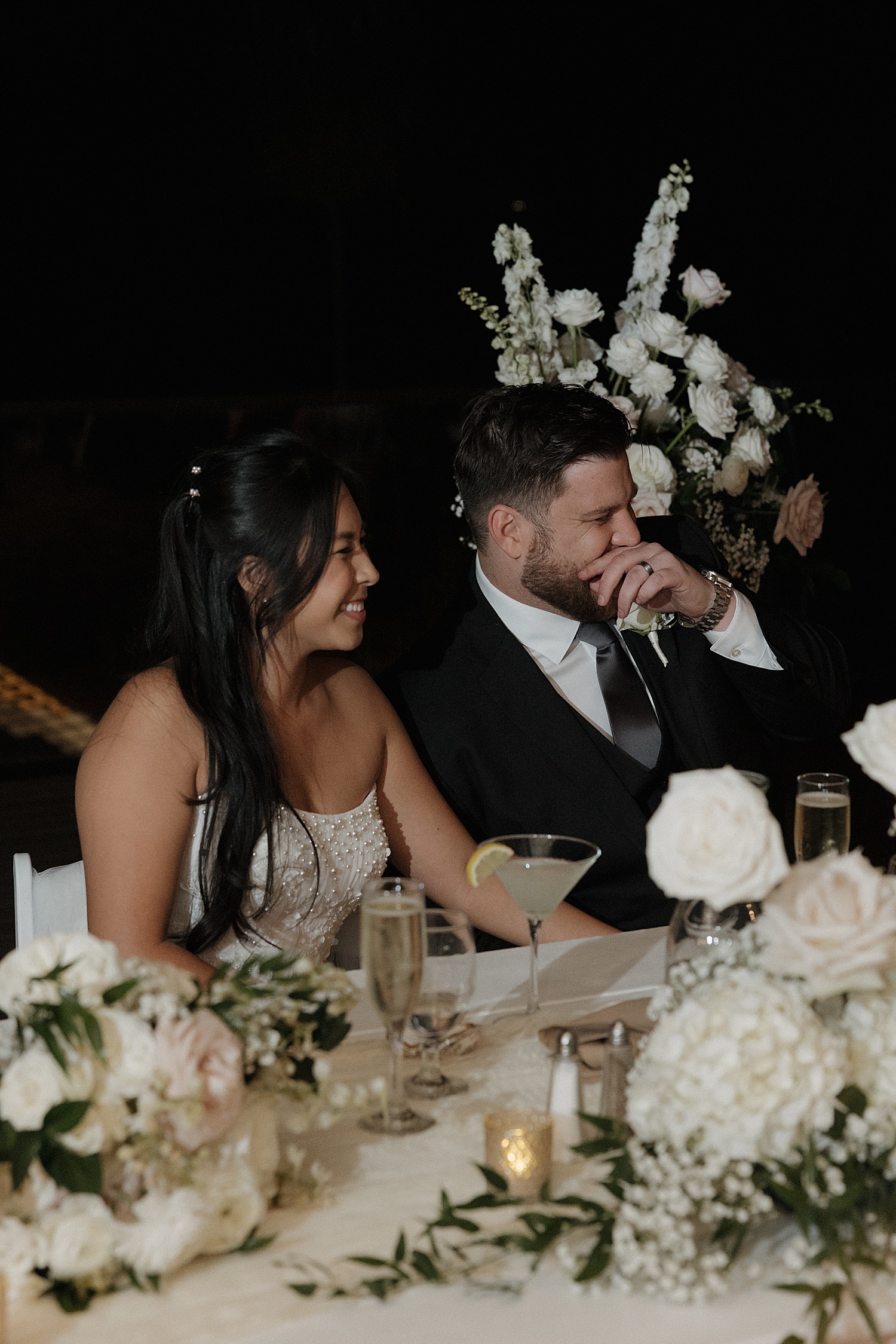 Their reception took place on the open-air deck, where long tables were styled with delicate florals, soft linens, and thoughtful details that created a beautifully cohesive design. As the evening unfolded, the energy shifted into celebration—champagne flowing, laughter echoing, and the dance floor quickly filling with so much joy.